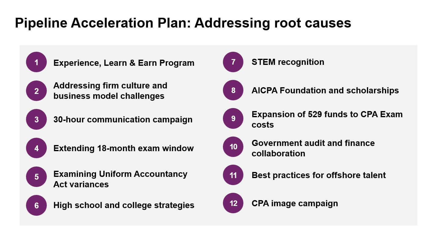 The detailed plan emerged after AICPA participated in a dialogue with various stakeholders before publishing its plan, including state CPA societies, accounting firms, academia, state boards of accountancy and their organizing body, the National Association of State Boards of Accountancy. The AICPA plans to create a clearinghouse for innovative pipeline ideas and hold stakeholder forums to discuss issues, set data-driven goals and measure outcomes to provide accountability.