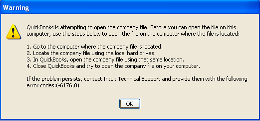QuickBooks is attempting to open the company file. Before you can open the file on this computer, use the steps below to open the file on the computer where the file is located. Go to the computer where the company file is located. Locate the company file using the local hard drives. In QuickBooks, open the company file using the same location. Close QuickBooks and try to open the company file on your computer. If the problem persists, contact and provide them with the following error codes (-6176, 0)