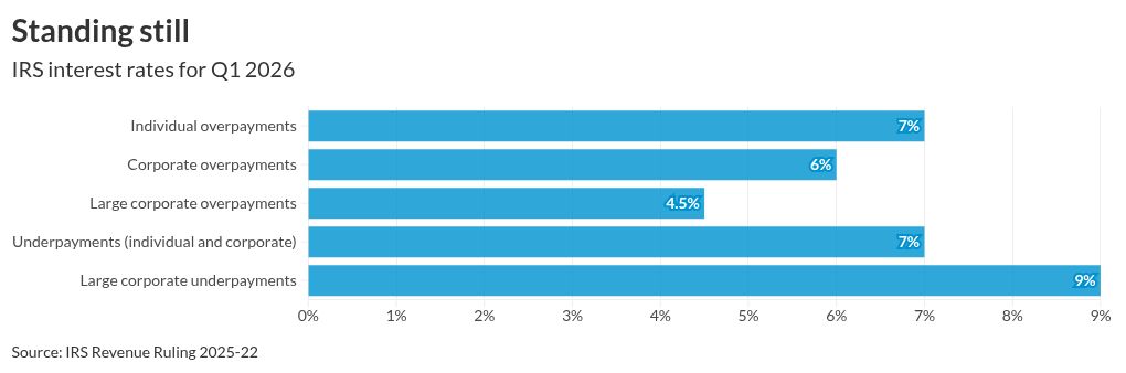 Interest rates will remain the same for the calendar quarter beginning Jan. 1, 2026, according to the Internal Revenue Service.