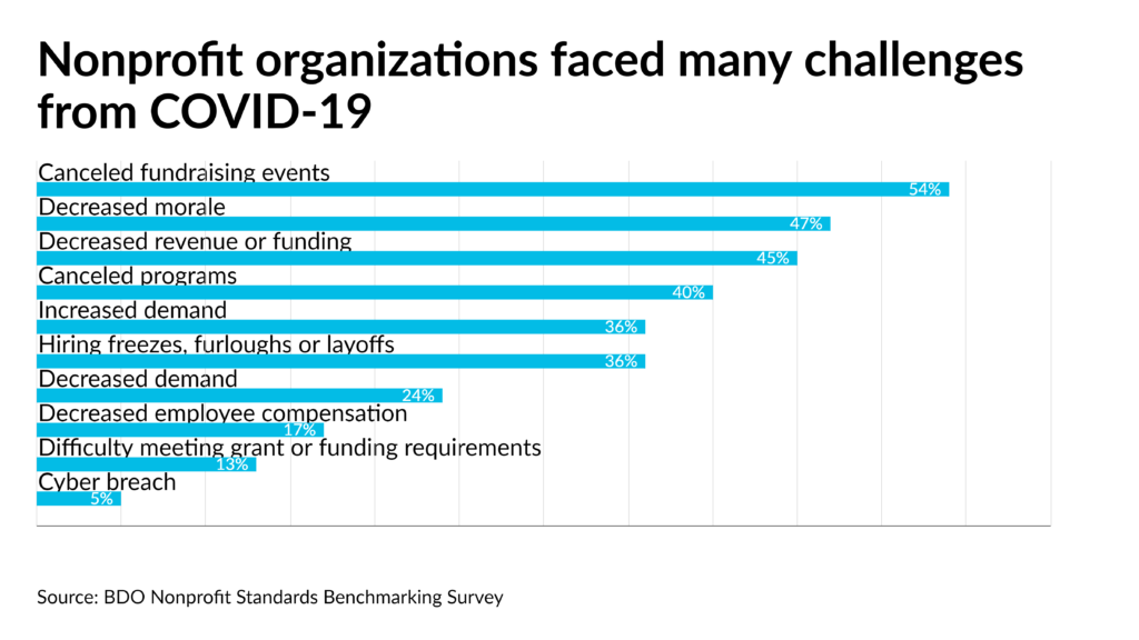 Nonprofits nevertheless have been facing many challenges in dealing with the human toll from the pandemic. “A lot of the organizations were first responders, either because they were health care or human services organizations, so the demand for their services actually increased,” said Andrea Espinola Wilson, who co-leads BDO’s nonprofit and education advisory services practice. “Organizations dealt with a tremendous amount of uncertainty in their funding and the way that they typically fundraise. But what we saw was that organizations were dramatically resilient in the face of the ever-changing landscape of COVID.”
