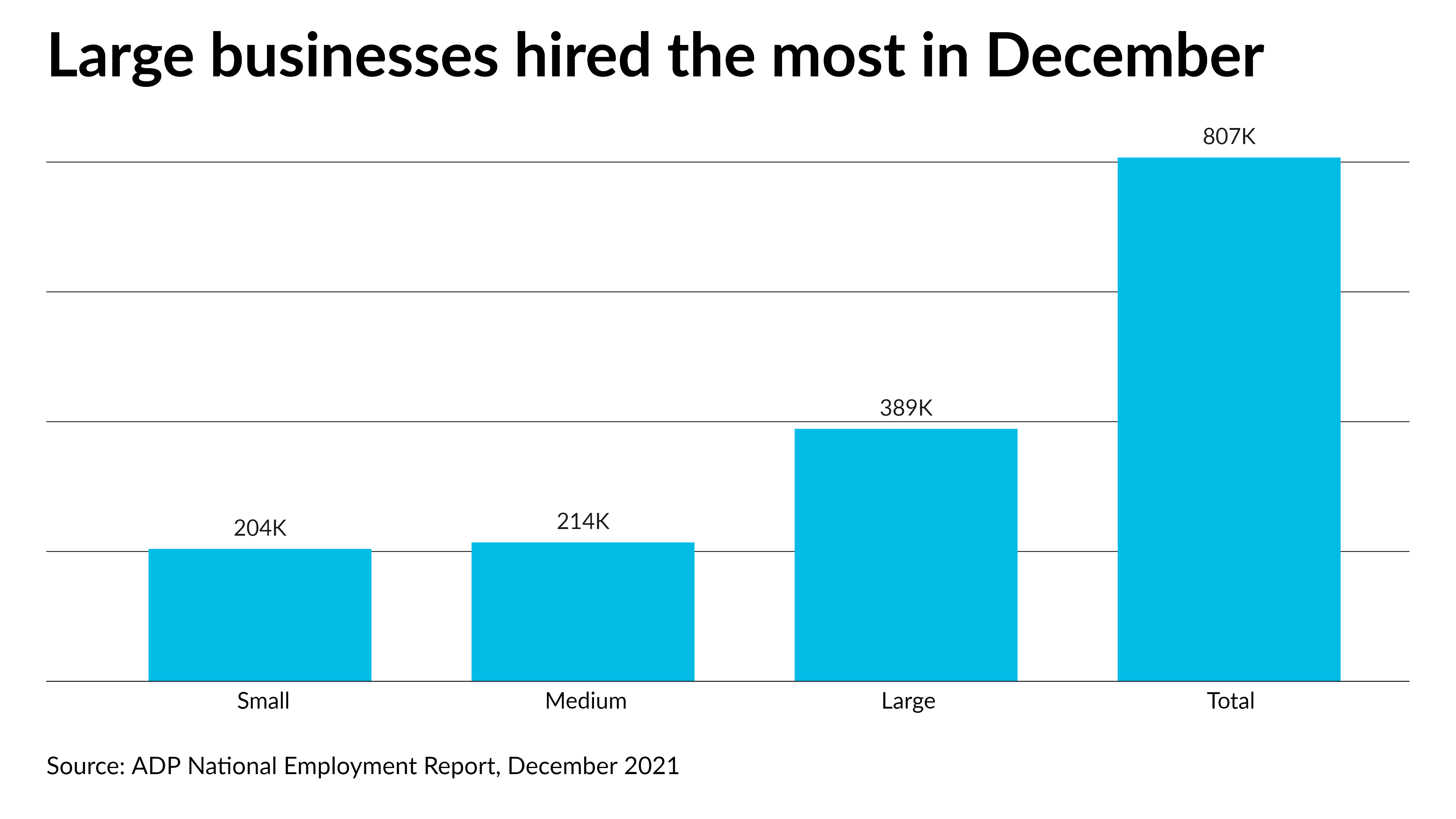 Small businesses gained 204,000 jobs, including 104,000 at firms with between one and 19 employees and 100,000 at companies with between 20 and 49 employees, according to the ADP National Employment Report. Medium-sized businesses with between 50 and 499 employees added 214,000 jobs. Large businesses added 389,000 jobs, including 70,000 at companies with between 500 and 999 employees and 319,000 at corporations with 1,000 employees or more.