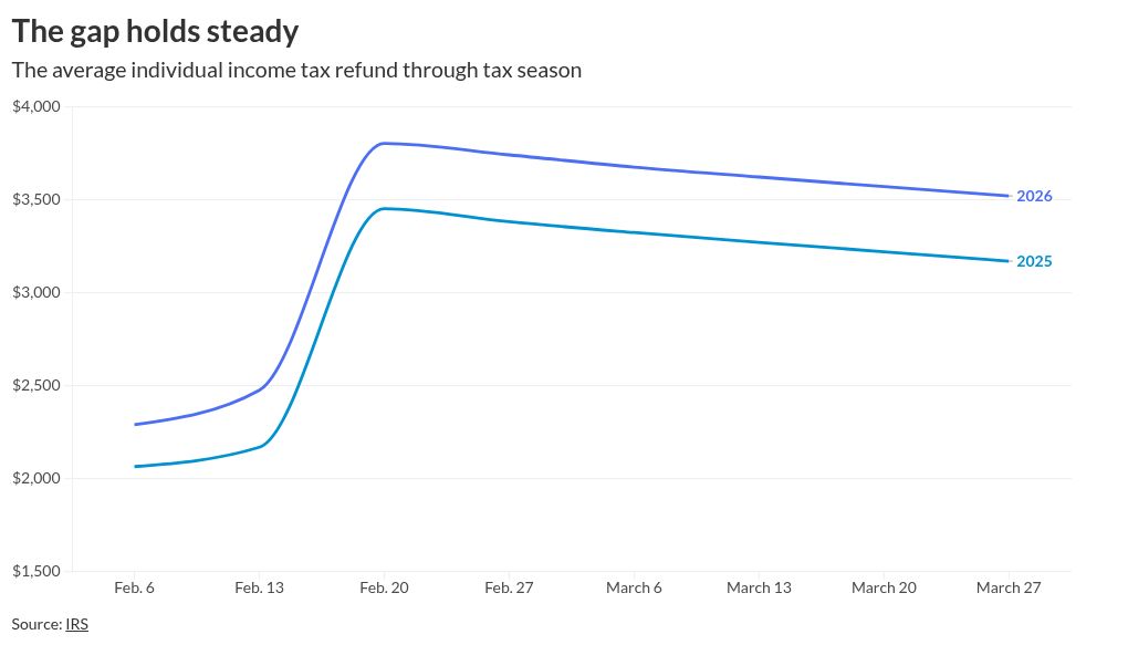 Refunds were much larger this year, however — the average refund as of March 27 was worth $3,521, up 11.1%, or roughly $350, from last year.